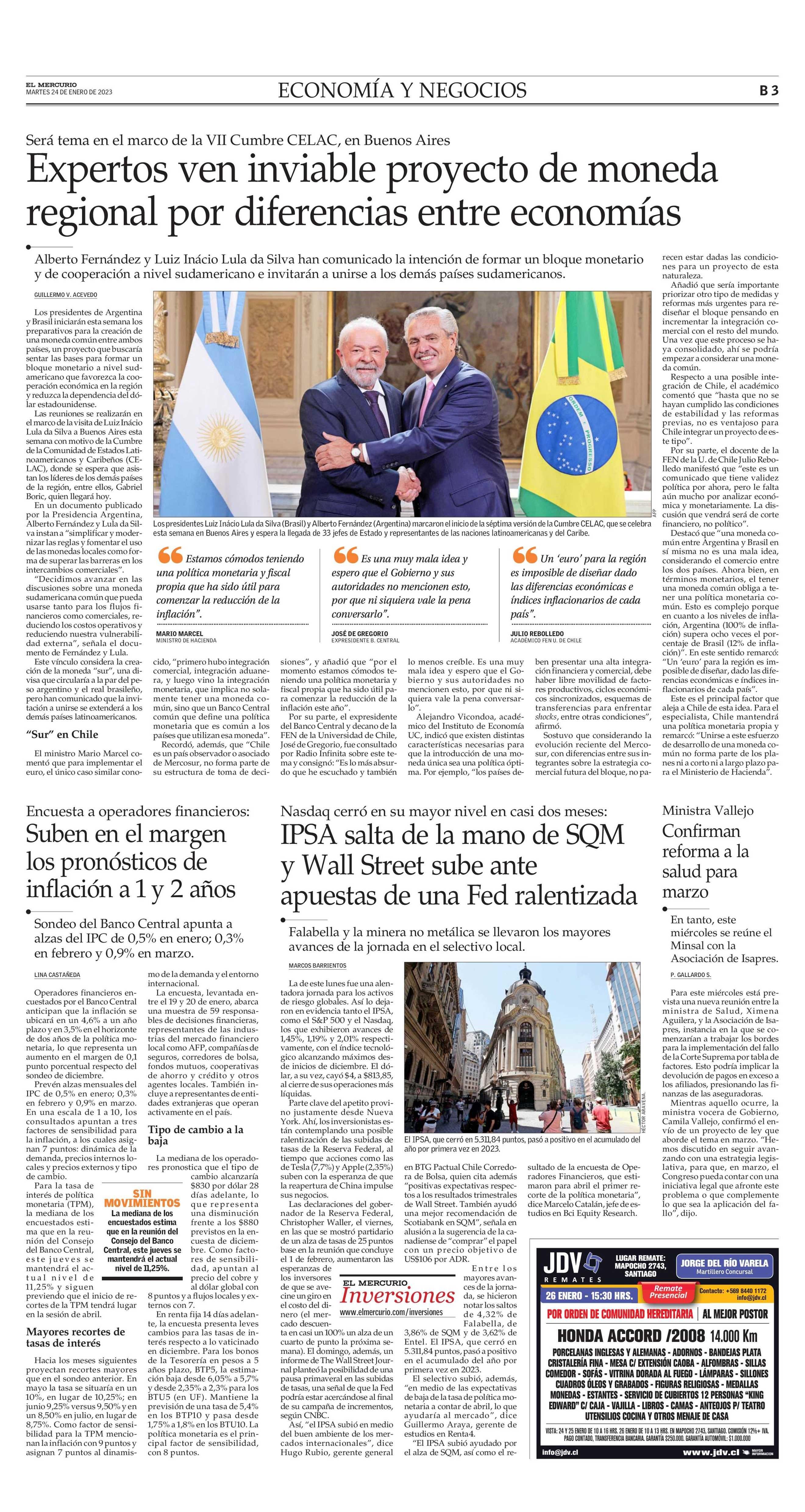 El Mercurio 23/01/2023 Expertos ven inviable proyecto de moneda regional por diferencias entre economías