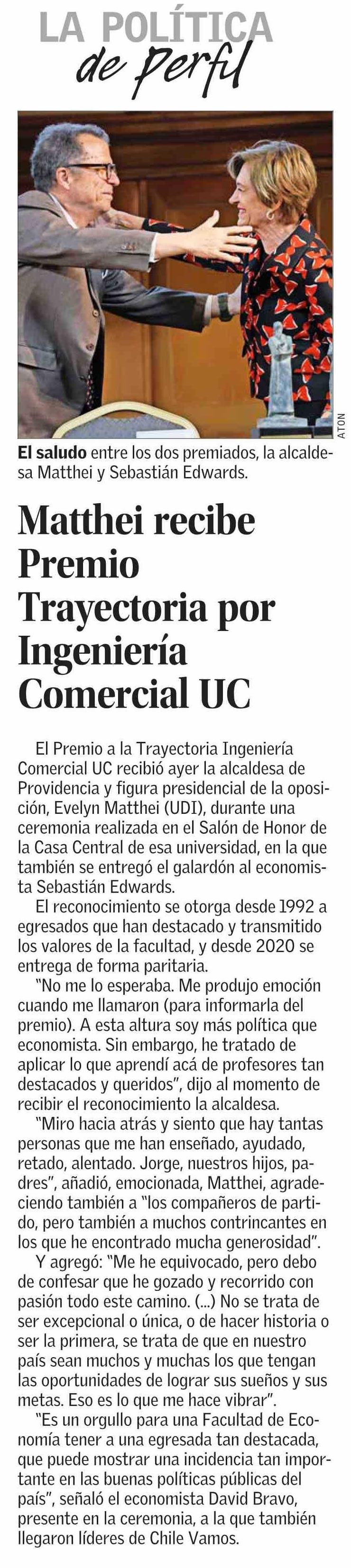 La Tercera 03/04/2024 Bellolio coincide con Matthei en actividad de la PUC y reitera que está “disponible” para competir por Providencia