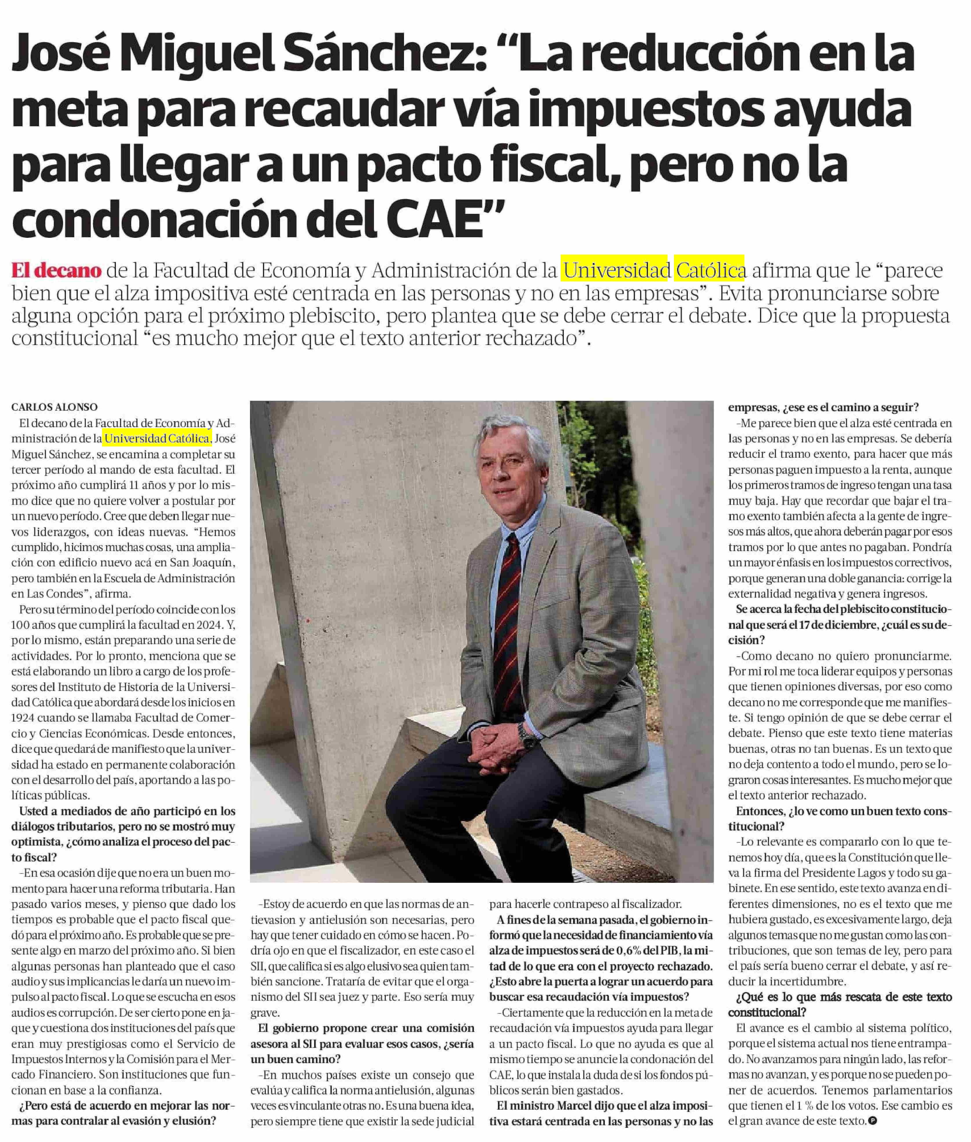 Pulso 04/12/2023 José Miguel Sánchez: “La reducción en la meta para recaudar vía impuestos ayuda para llegar a un pacto fiscal, pero no la condonación del CAE”