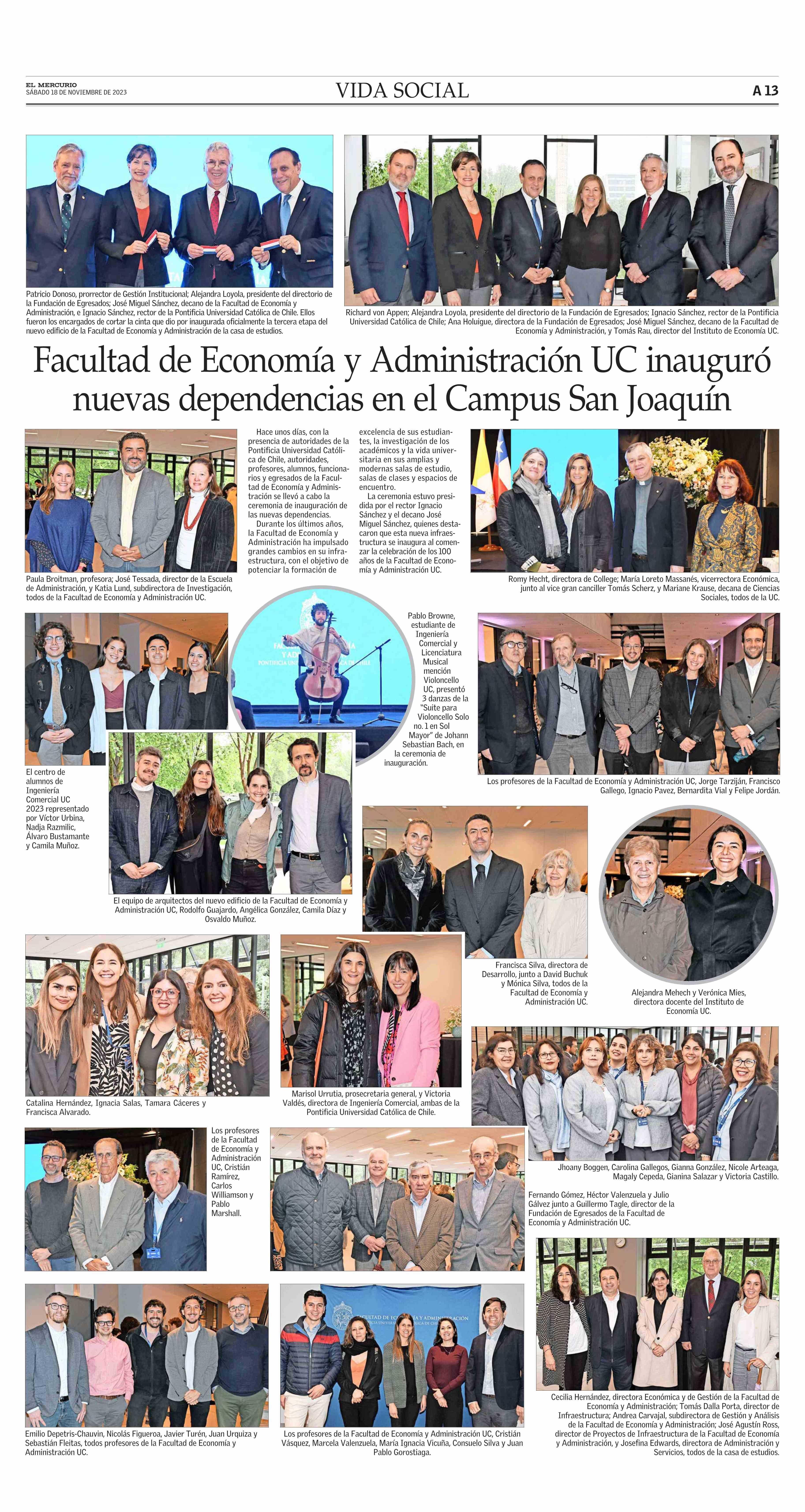 El Mercurio 18/11/2023 Facultad de Economía y Administración UC inauguró nuevas dependencias en el Campus San Joaquín