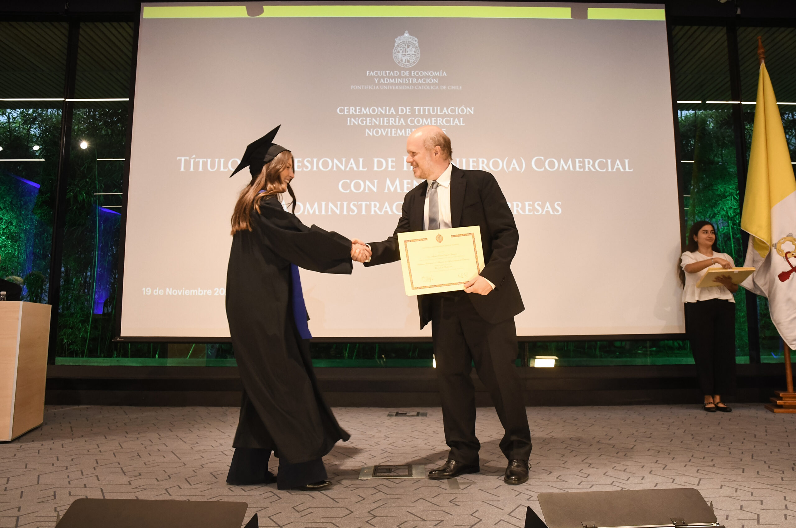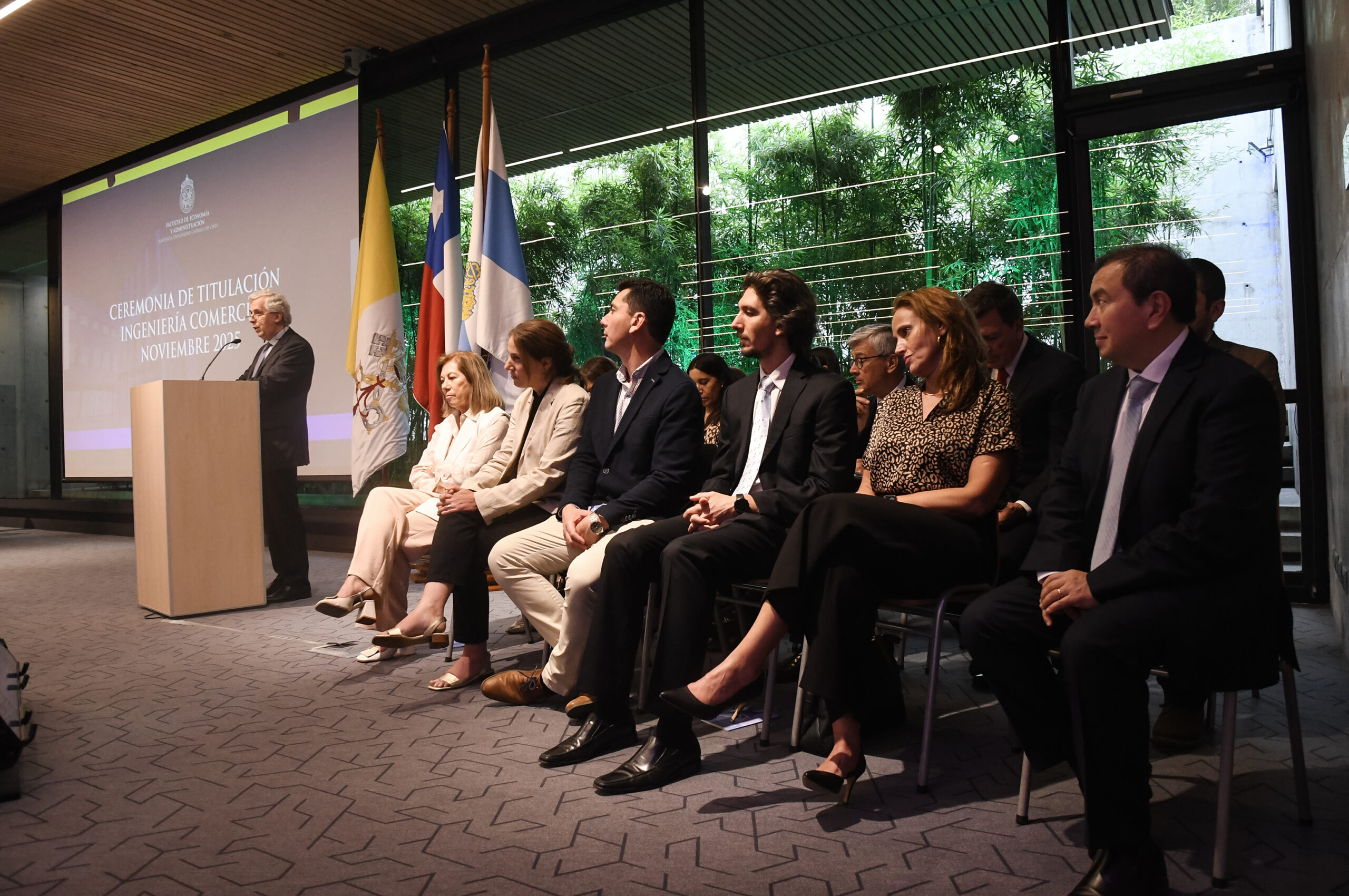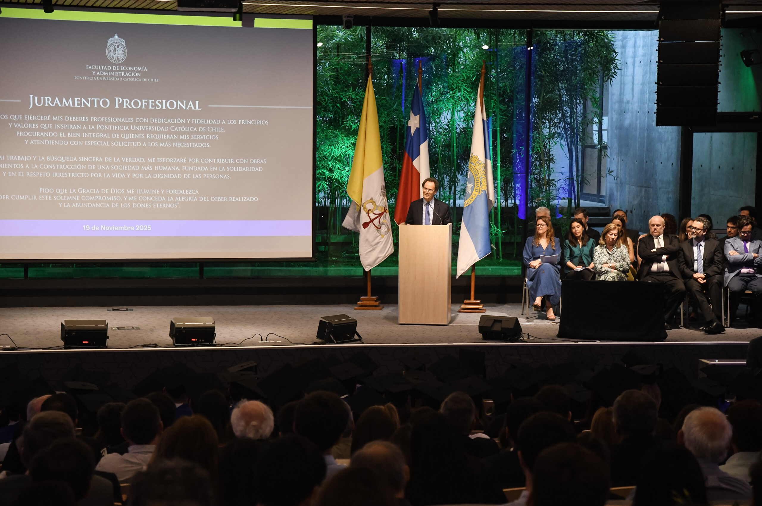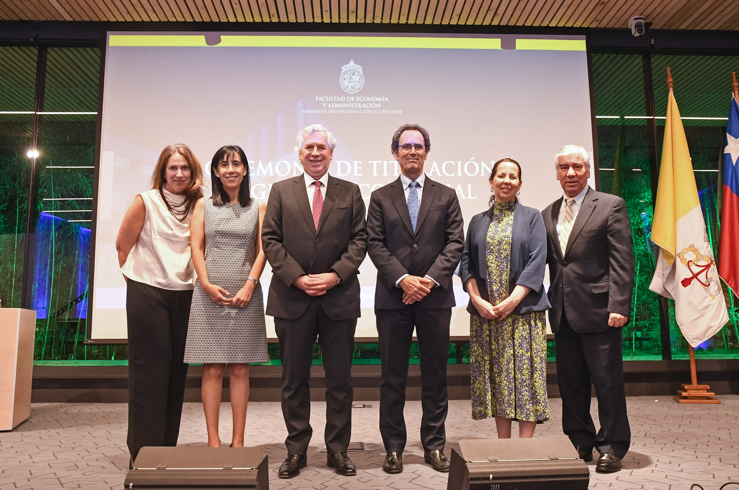 También se dirigió a los titulados el Decano de la Facultad de Economía y Administración UC, José Miguel Sánchez: “Cada uno de nosotros tiene una misión. Está en nosotros encontrarla y seguirla. Por eso, la invitación que les hago es entender su profesión como una llamada a hacer todo lo que esté a su alcance para cambiar de manera positiva la vida de los demás. Por eso es que las personas deben estar al centro de nuestro quehacer”.