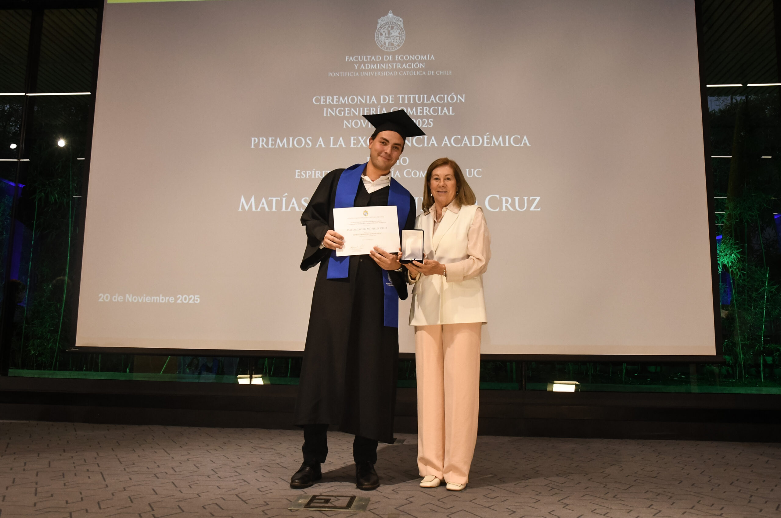 Finalmente, el Premio “Espíritu Ingeniería Comercial UC”, entregado por Anita Holuigue a nombre de la Fundación Economía y Administración Alumni UC, fue para Matías Murillo.