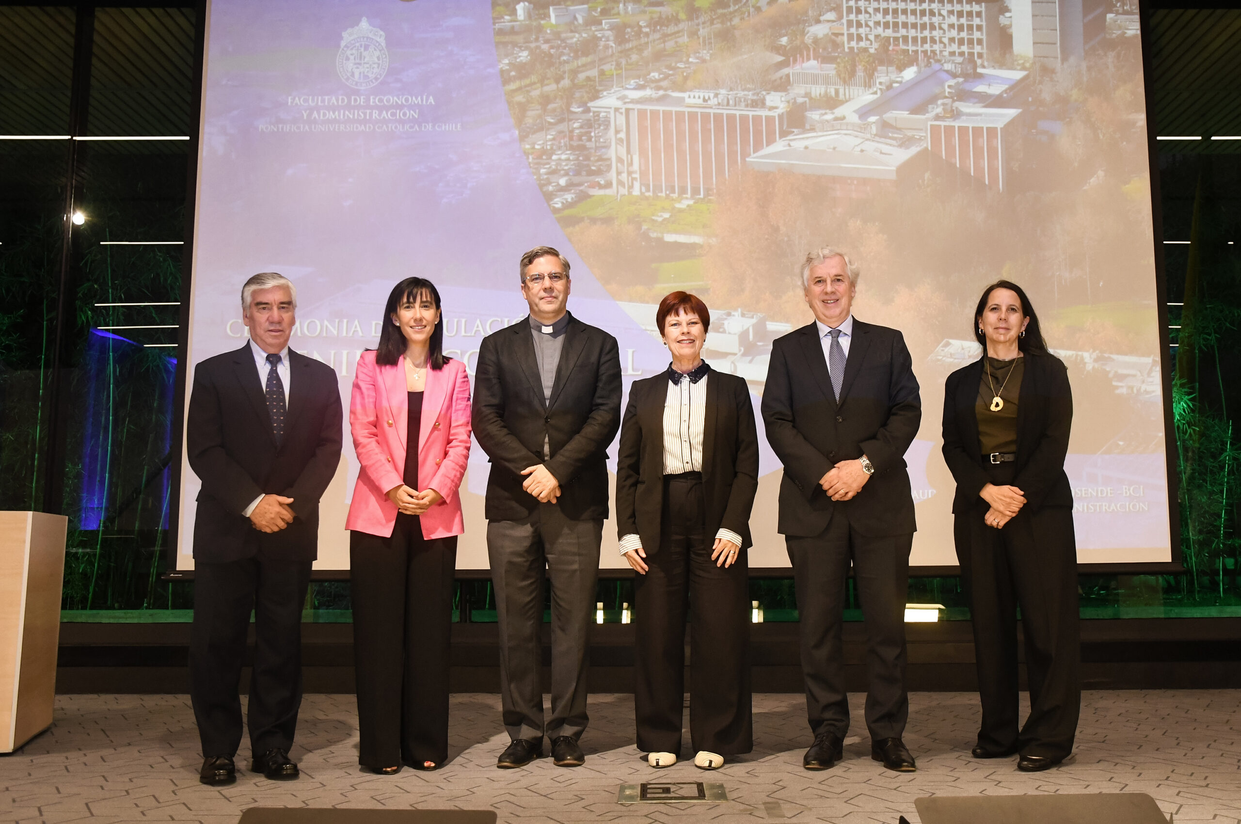 También participó de estas ceremonias la destacada egresada de la Facultad, Anita Holuigue, quien fue distinguida con el Premio a la Trayectoria de Ingeniería Comercial 2024. Esta distinción nace el año 1992 y es entregada por la Fundación Economía y Administración Alumni UC a un ingeniero comercial de la Universidad que destaque por sus características profesionales y humanas.